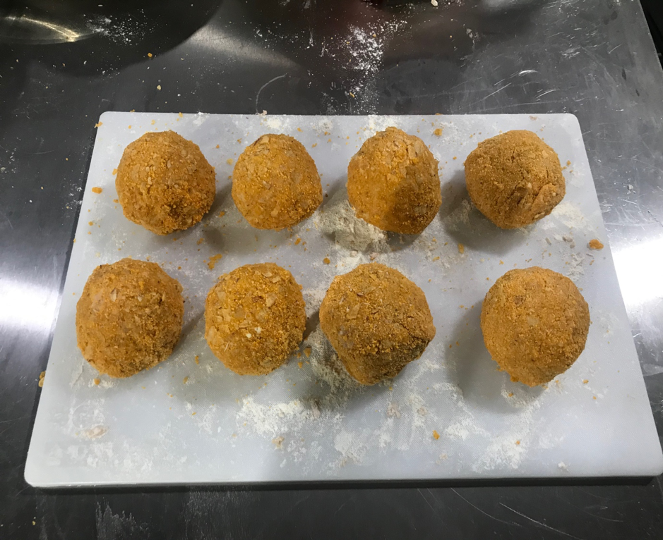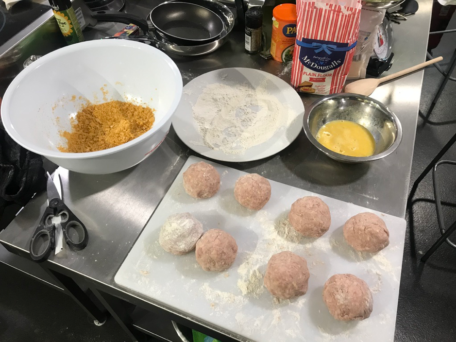 Step five: One at a time, roll each ball firstly into the flour, then the beaten egg and finally the breadcrumb mixture