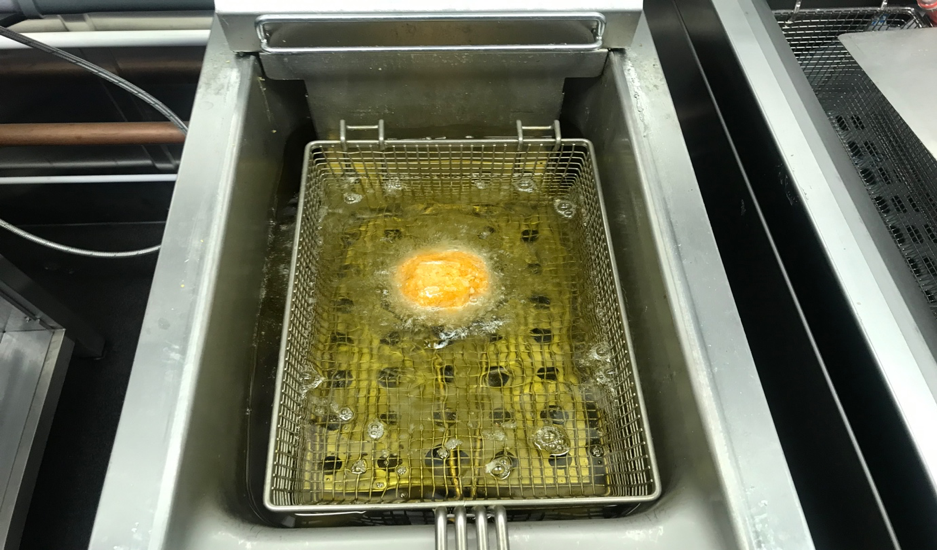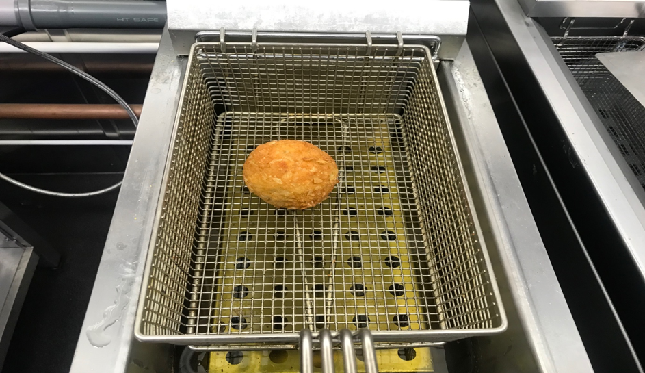Step Six: Pre heat a deep fat fryer to 180°C. Place into a deep fat fryer no more than 1-4 Scotch Eggs and cook for approximately 2 minutes or until the breadcrumbs are lightly browned.